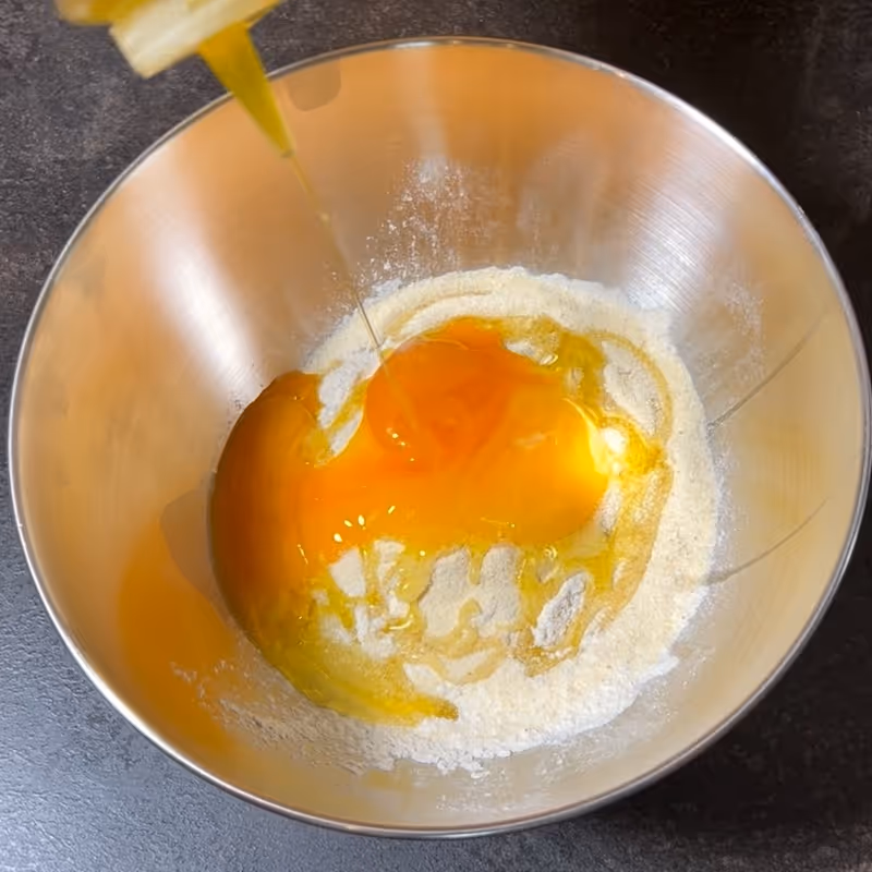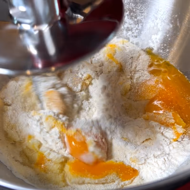 - In a large bowl or mixing bowl, combine the flour, semolina, egg yolks, and olive oil.