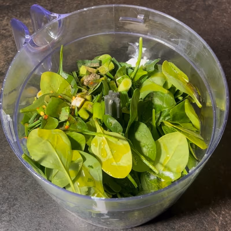 - Add the greens to a food processor along with ricotta, chili flakes, olive oil, salt, and pepper.