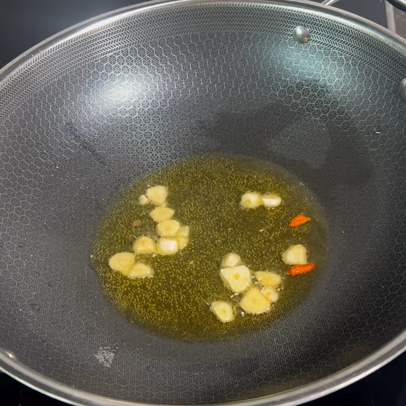 - In a skillet, heat the olive oil and toast the garlic and chili gently—don't let them burn.