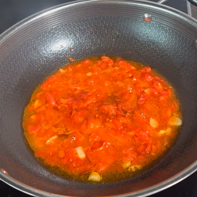 - Add the chopped tomatoes, season with salt, pepper, and sugar, and simmer for 10 minutes.