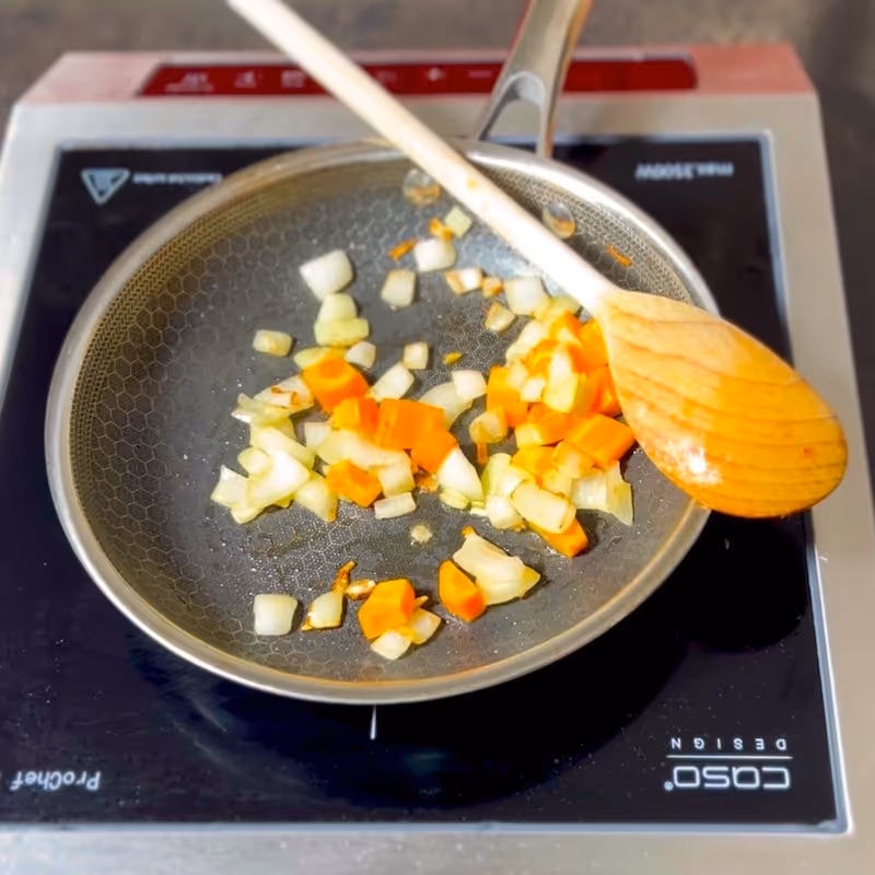 - Heat 1 tbsp of oil in a skillet over medium heat. Add the finely chopped carrot and onion and sauté for 2-3 minutes.