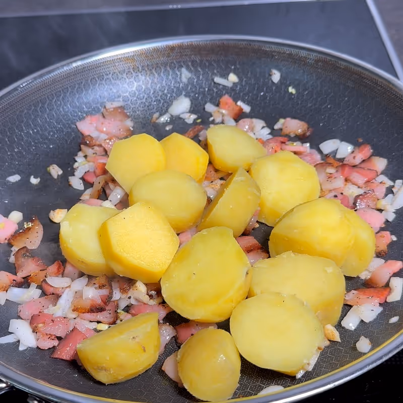 - Build the Skillet Base: Cut the bacon into 1 cm cubes and fry them on medium-high heat until they turn translucent.