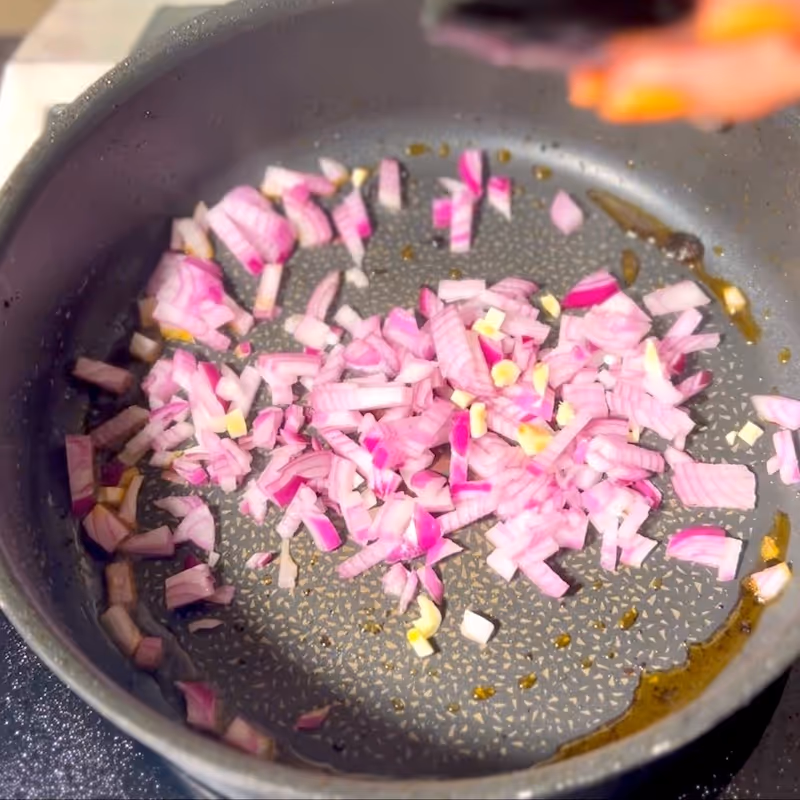 - Add the diced onion and minced garlic, cooking until softened and fragrant.