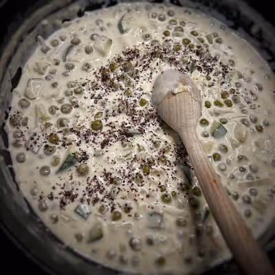 - Take a saucepan. Cook the chopped onion until translucent. Combine the vegetable stock with double cream, dijon mustard, salt, pepper, and a pinch of nutmeg. Add the chopped zucchini and cook on medium heat for 10-15 minutes or until the sauce reduces to half and is bubbly.