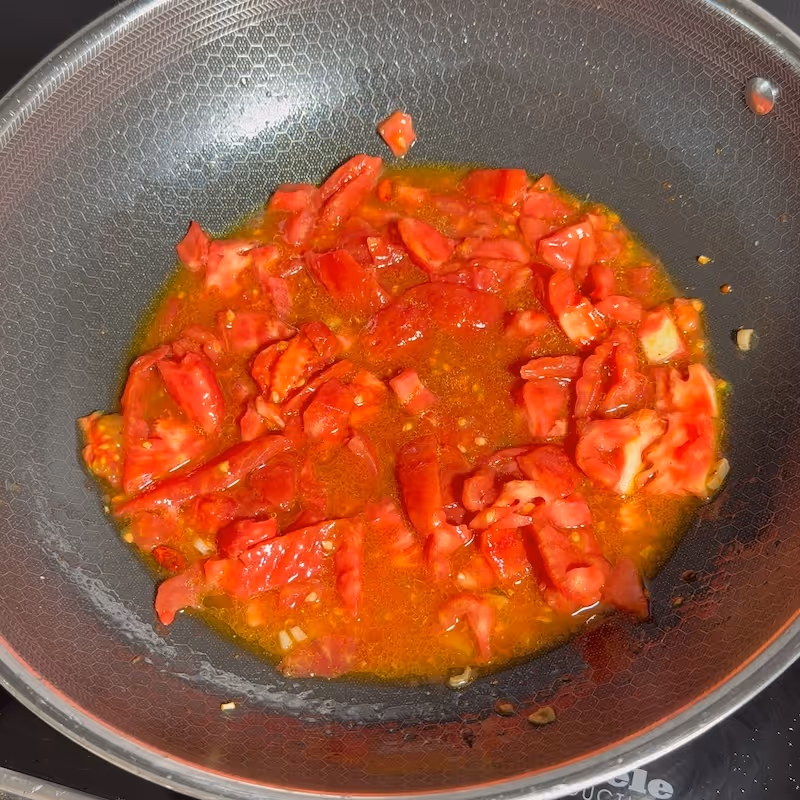 - Add the prepared tomatoes and cook for about 3–4 minutes over medium heat until they release their juices and form a sauce.