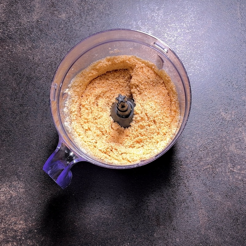 - In a food processor, add the graham crackers, melted butter, dried coconut, egg yolk, and sugar.