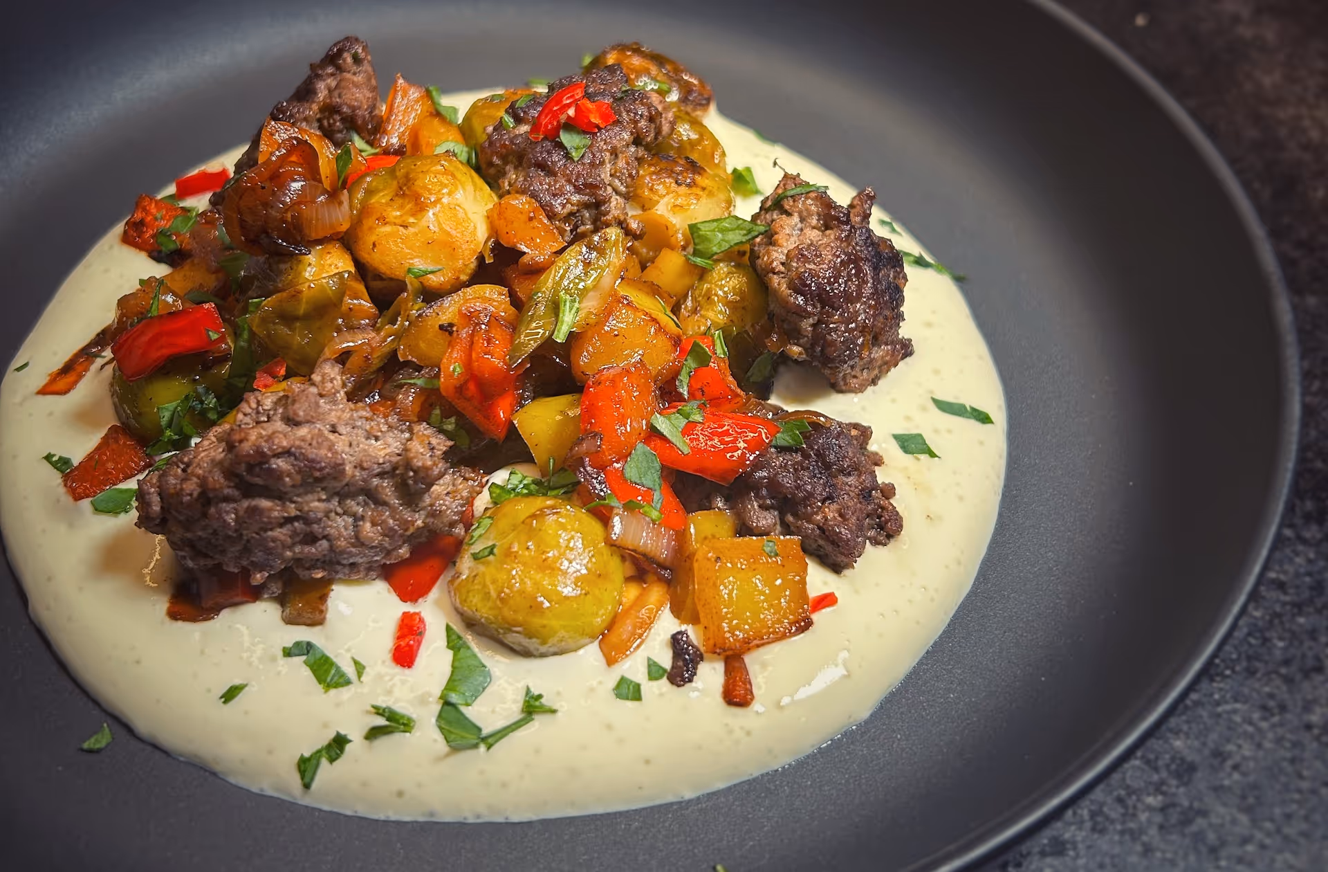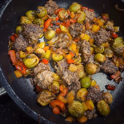 Quick, fancy Weeknight Sizzling Stir Fry Dinner with Brussels Sprouts, beef patties, and a creamy base, perfect for a tasty, nutritious meal.