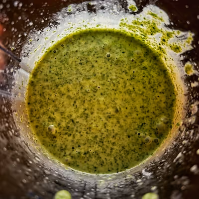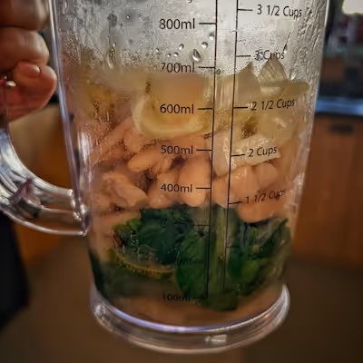 - Blend half of the beans in a blender with the blanched wild garlic, cooked leek, and 100g of rice cream until smooth.
