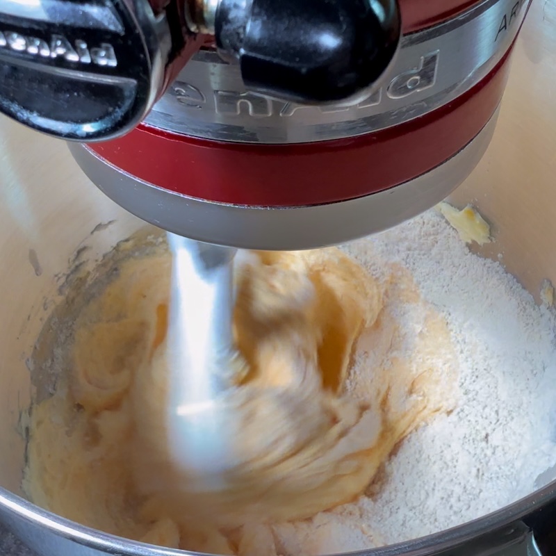 - In a separate bowl, mix soft butter with sugar, vanilla, and egg yolks until creamy.