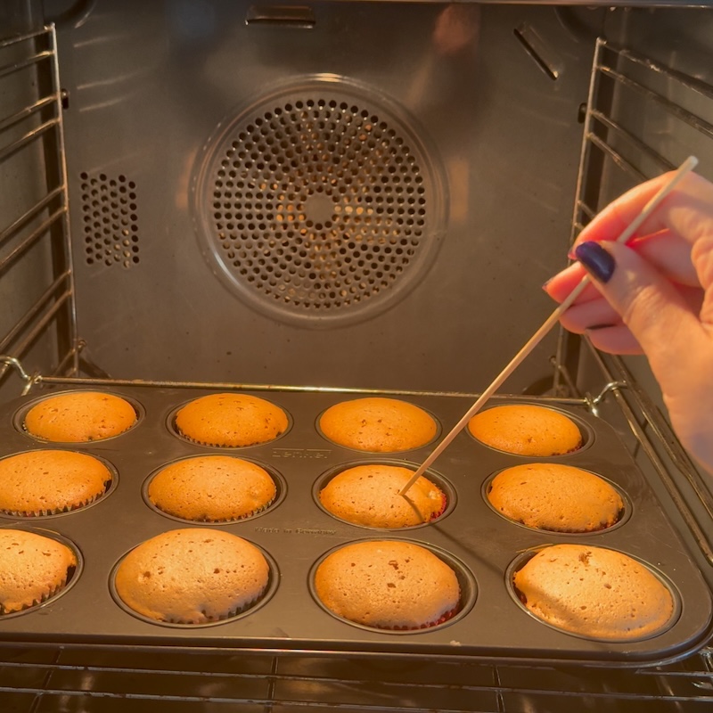 - Fill each cup with batter (a measuring cup makes this easy).