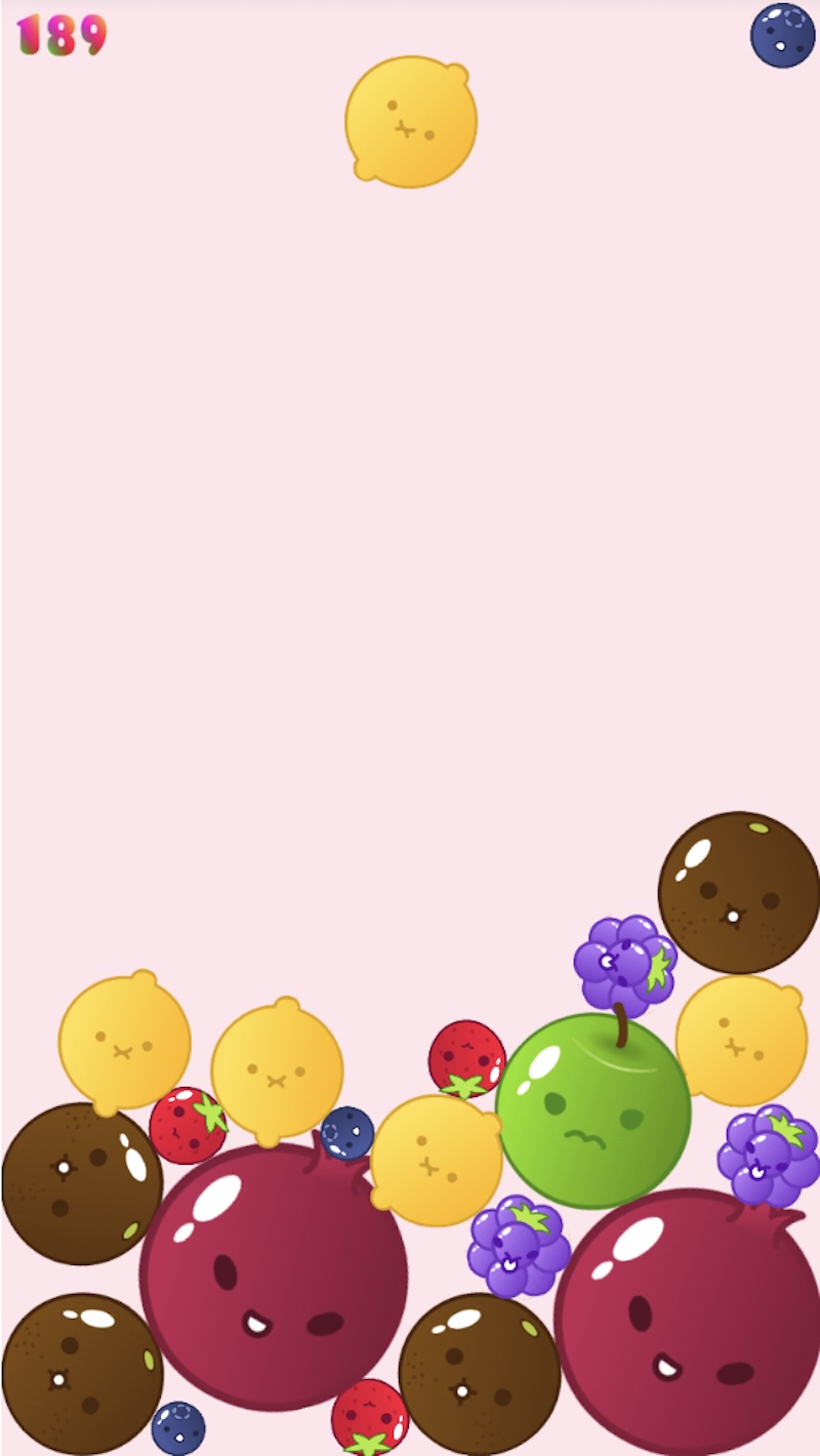 The watermelon/fruit-merge idea is simple and addictive: drop a piece, match two of the same, watch them merge into something bigger, don't overflow the bin.